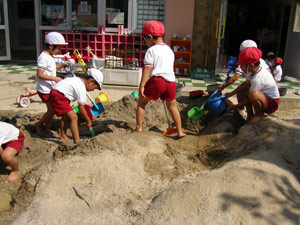 子どもが安心して自己発揮できる環境を整え心身の発達を助成し、健康でたくましく、かつ自主的な心を養い、情緒豊かな幼児の育成を目標としています。